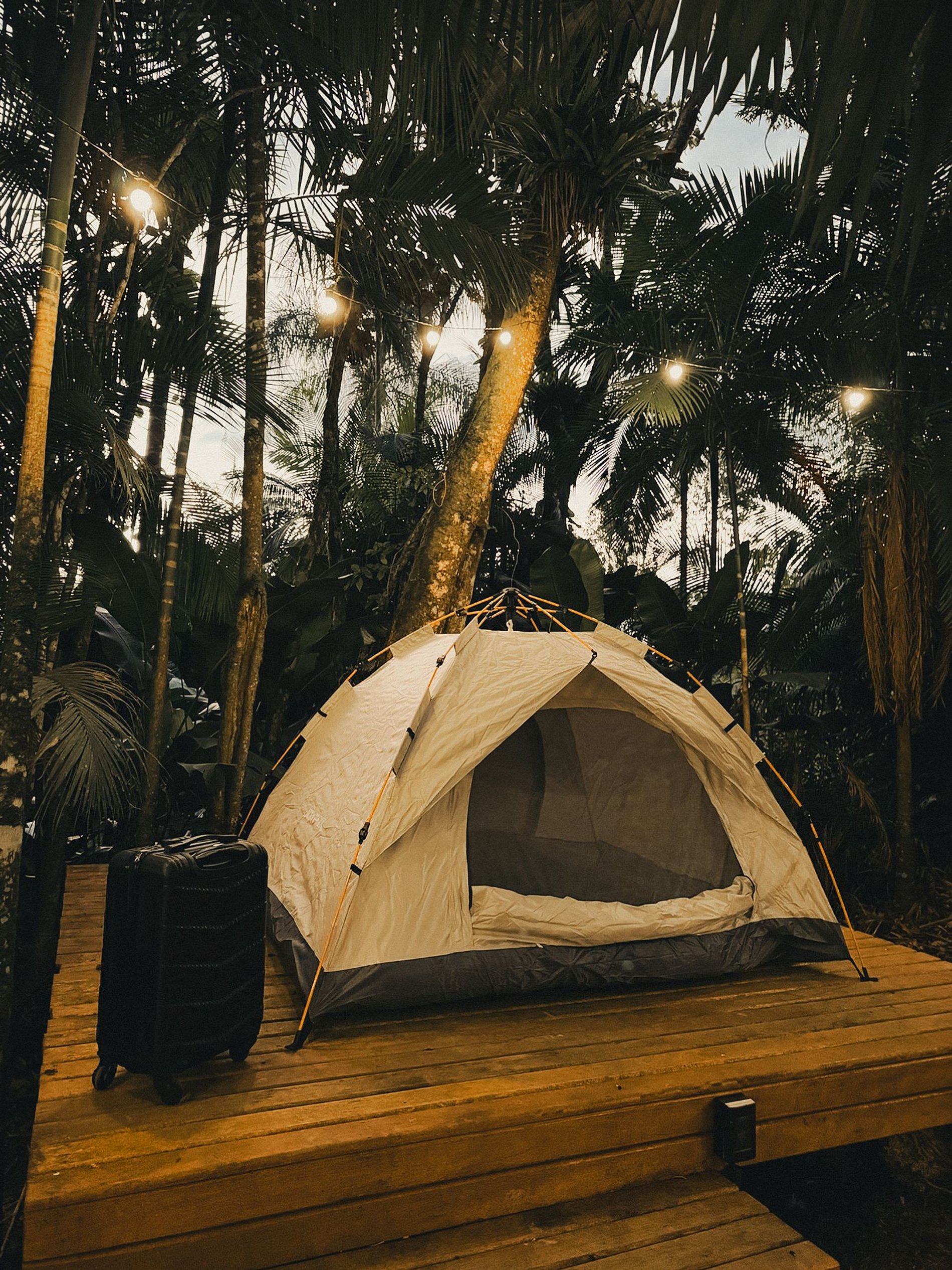 As barracas são montadas sobre decks de madeira, com ponto de energia e iluminação decorativa. À noite, os varais de luzes e a lareira comunitária criam um clima mágico para encontros sob as estrelas.