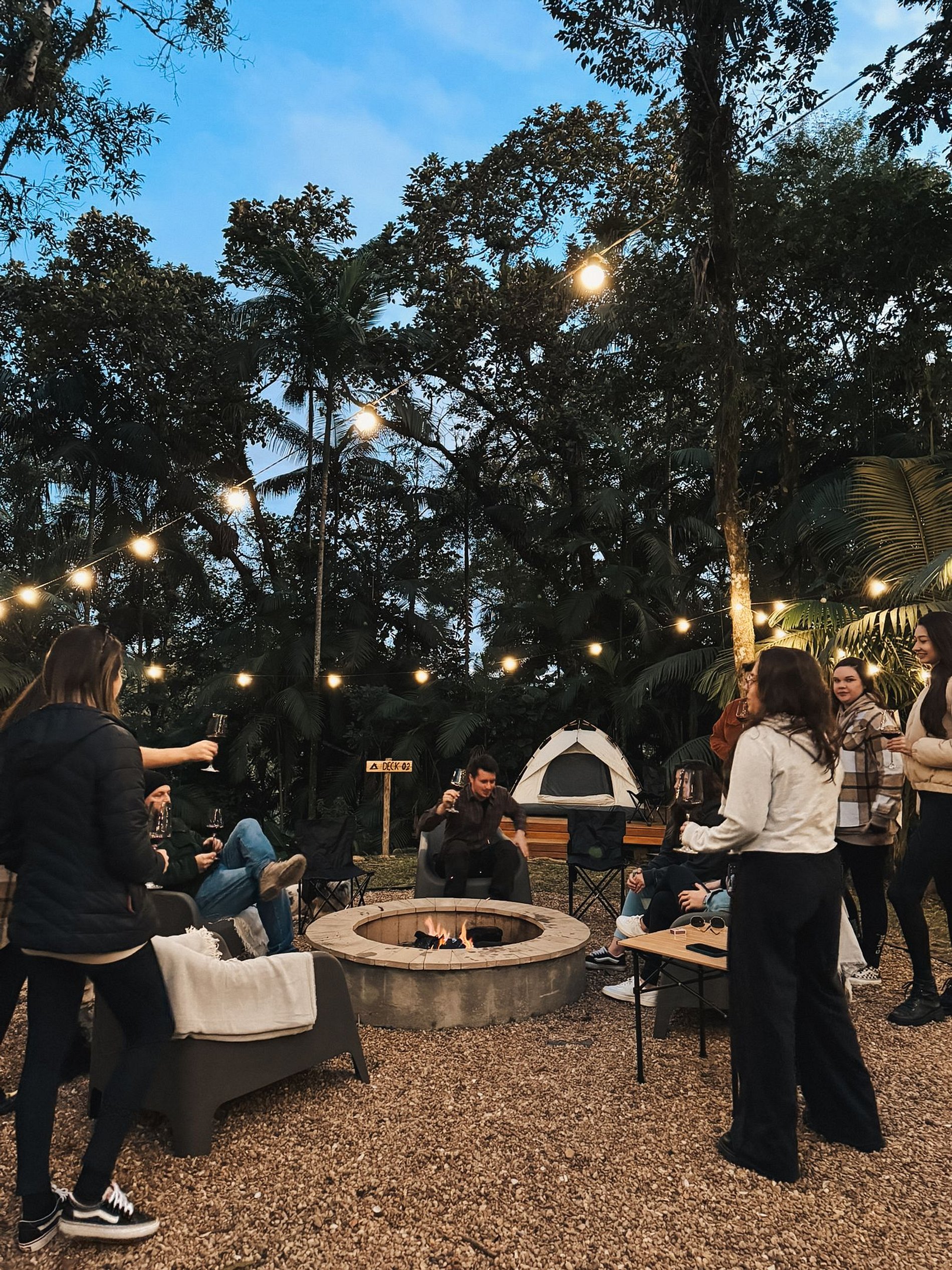 Acampamento do Bosque combina natureza e conforto em um ambiente encantador. Oferece: Deck privativo com ponto elétrico, ideal para praticidade e iluminação. Área de churrasqueira compartilhada, equipada com mesa, cuba e espaço coberto para socializar e cozinhar. Lareira no pátio central, perfeita para noites aconchegantes ao redor do fogo. Varal de luz no pátio, criando uma atmosfera mágica e acolhedora. Um refúgio perfeito para momentos inesquecíveis ao ar livre. Acesso total ao Parque.