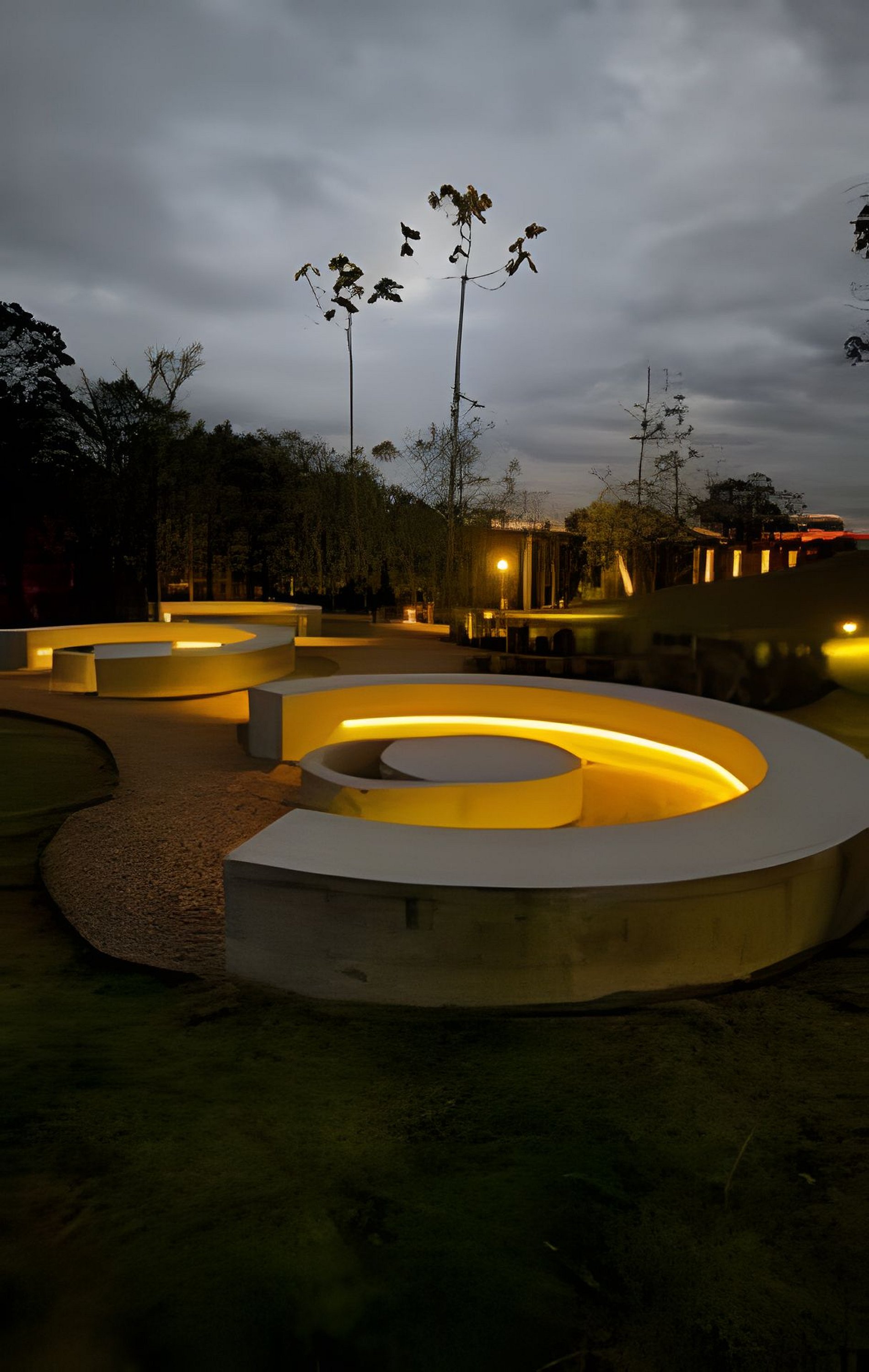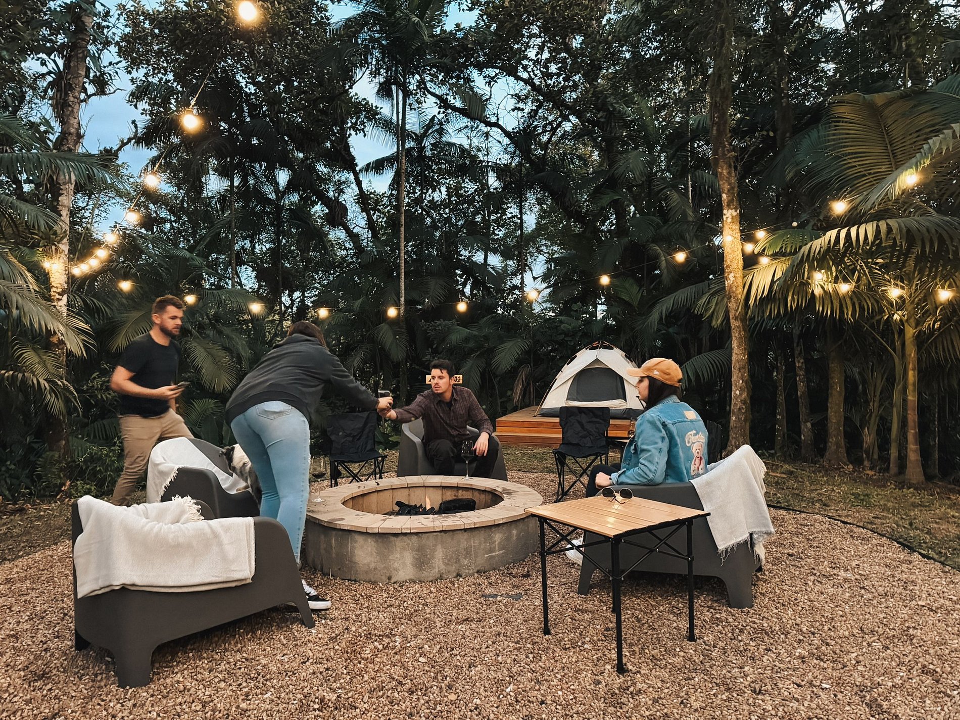 As barracas são montadas sobre decks de madeira, com ponto de energia e iluminação decorativa. À noite, os varais de luzes e a lareira comunitária criam um clima mágico para encontros sob as estrelas.