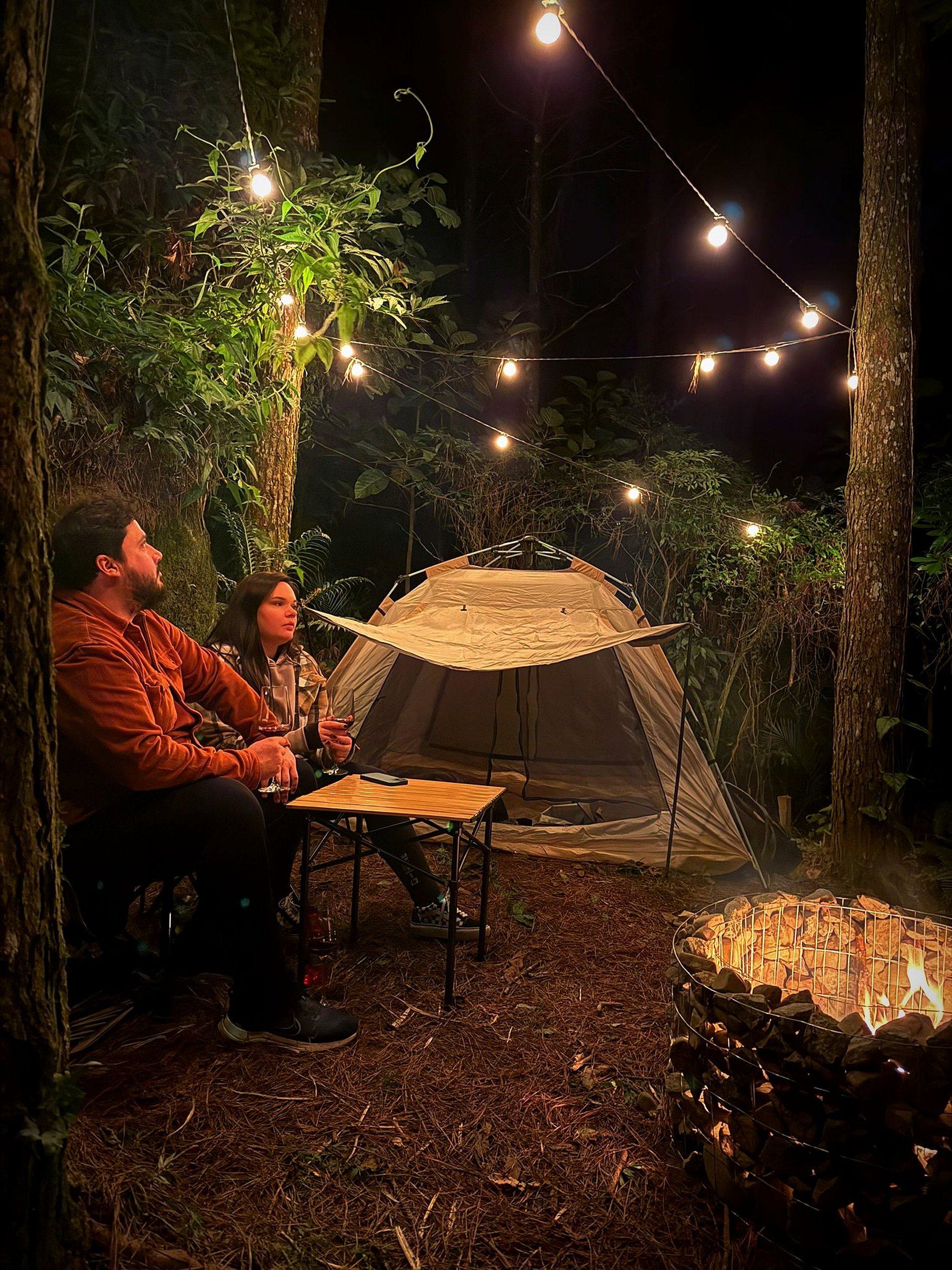 Acampamento do Bosque (Glamping): decks elevados com energia, varais de luz, lareira comunitária e apoio completo