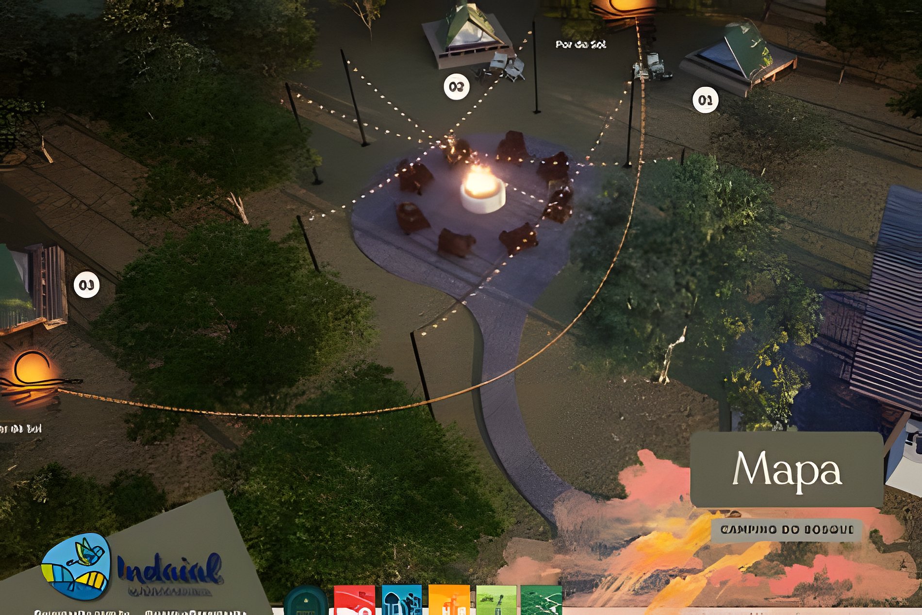 Acampamento do Bosque combina natureza e conforto em um ambiente encantador. Oferece: Deck privativo com ponto elétrico, ideal para praticidade e iluminação. Área de churrasqueira compartilhada, equipada com mesa, cuba e espaço coberto para socializar e cozinhar. Lareira no pátio central, perfeita para noites aconchegantes ao redor do fogo. Varal de luz no pátio, criando uma atmosfera mágica e acolhedora. Um refúgio perfeito para momentos inesquecíveis ao ar livre. Acesso total ao Parque.