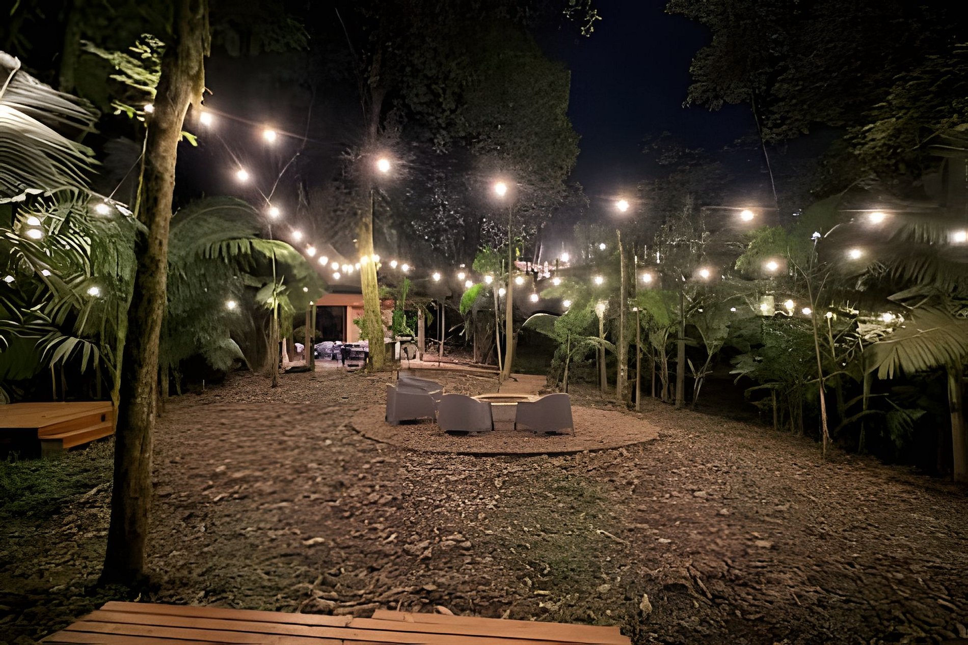 As barracas são montadas sobre decks de madeira, com ponto de energia e iluminação decorativa. À noite, os varais de luzes e a lareira comunitária criam um clima mágico para encontros sob as estrelas.